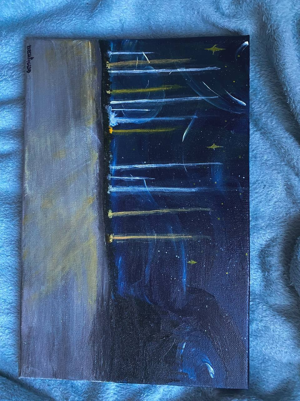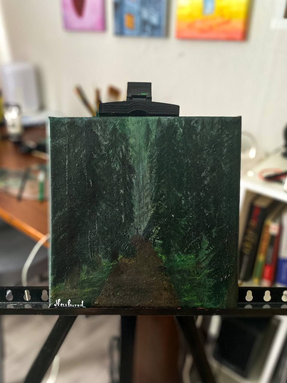 Фон картины выполнен в темных, мрачных тонах, что подчеркивает глубину и загадочность леса. Вдалеке, сквозь деревья, виден проблеск света, символизирующий надежду и возможность выбраться из чащи. Но дойти до выхода очень проблематично.